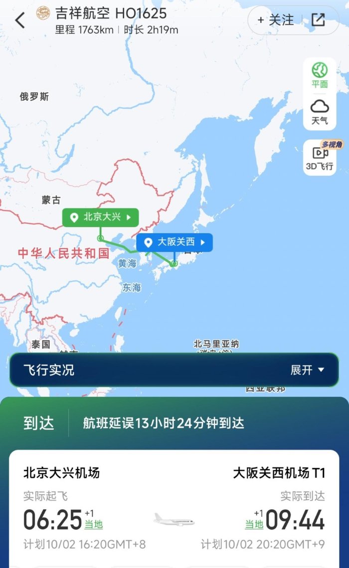 据“航旅纵横”显示,最终HO1625航班于3日早晨6时25分起飞,当地时间9时44分到达大阪,延误13小时24分钟到达。